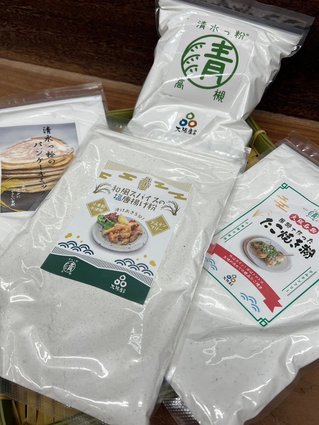 高槻清水地域産ブランド米粉【清水っ粉】はパンや焼き菓子をはじめ、お好み焼きや天ぷらなど、幅広いメニューに使っていただけます。